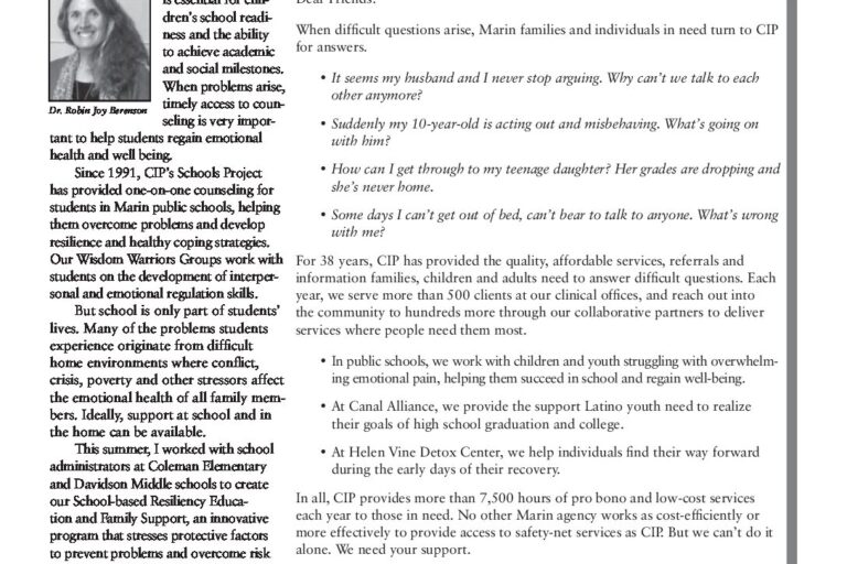 When difficult questions arise, Marin families and individuals in need turn to CIP for answers. It seems my husband and I never stop arguing. Why can’t we talk to each…