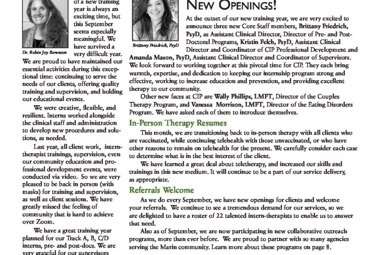 In this issue of Community Notes, we are very pleased to introduce five new members of the CIP community: Administrative Manager Juli Walsh; Assistant Clinical Directors Galia Schechter, PsyD, and…