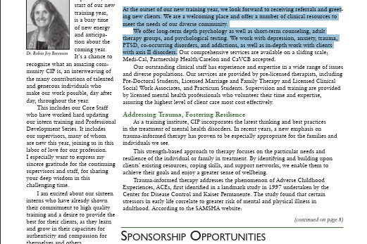 At the start of the training year, CIP has openings for new clients interested in short- and long-term counseling and psychotherapy, adult support and therapy groups, and psychological testing. Our…